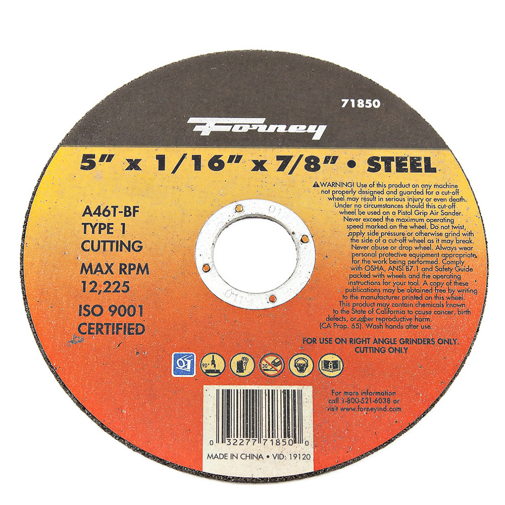 This Forney aluminum oxide steel cutting wheel is ideal for use on ferrous materials. It's engineered for metal cutting, metal abrasion, body work, metal fabrication, and general repair work. Designed to be used on Right Angle Grinders only. Type 1 wheels feature a flat design for metal cutting applications. Product Specifications: Wheel Size: 5 in. Wheel Type: Type 1 (Flat). Thickness: 1/16 in. Arbor: 7/8 in. Abrasive Specification: A46T-BF. Abrasive Grain Type: A (aluminum oxide). Grit: 46 (medium). Bond Hardness: T (hard: longer life, slower cutting or grinding). Type of Bond: BF (resinoid fiberglass reinforced). Maximum Revolutions Per Minute (RPM): 12,225. Tool Type: Right Angle Grinder.